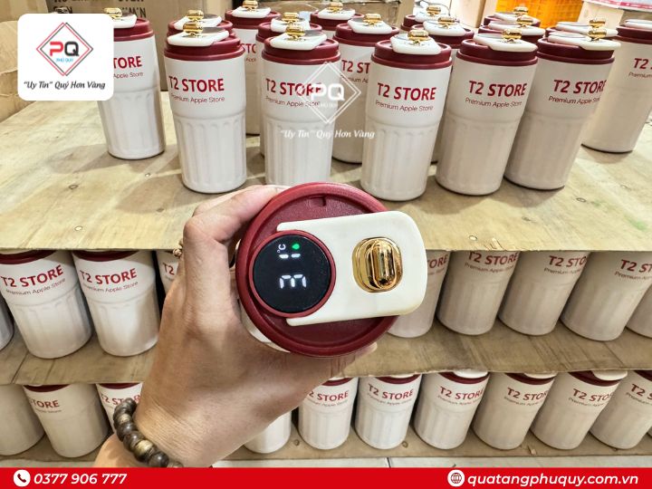 Mẫu bình giữ nhiệt in logo T2 Store sở hữu thiết kế hiện đại, màu sắc sang trọng, tích hợp màn hình hiển thị nhiệt độ thông minh, vừa mang tính công nghệ, vừa phù hợp với nhóm khách hàng trẻ, dân văn phòng và người yêu thích sản phẩm tiện ích. Đây là lựa chọn lý tưởng cho các chương trình tri ân, khai trương, ra mắt sản phẩm hoặc chăm sóc khách hàng thân thiết của cửa hàng điện thoại.