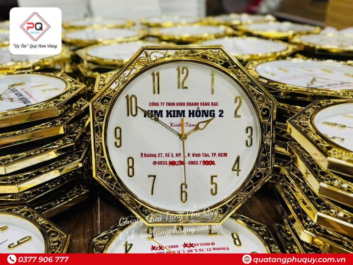 Một chiếc đồng hồ treo tường in logo không chỉ để xem giờ mà còn là “biển quảng cáo” xuất hiện 365 ngày trong năm ngay tại văn phòng, cửa hàng, nhà ở khách hàng. Mẫu đồng hồ treo tường in logo đa giác viền xi hoa văn vàng 12 số nổi 32cm nổi bật với thiết kế sang trọng, tông vàng ánh kim bắt mắt, phù hợp làm quà tặng doanh nghiệp, quà tặng sự kiện, quà tri ân khách hàng.