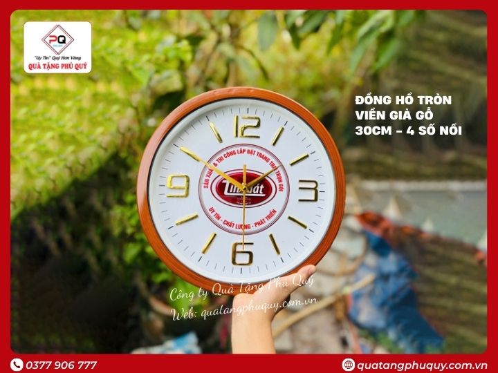 Đặc điểm đồng hồ treo tường in logo tròn vân sơn giả gỗ 4 số nổi